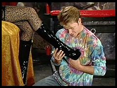 Hottie in black leather boots fucked by an old dick